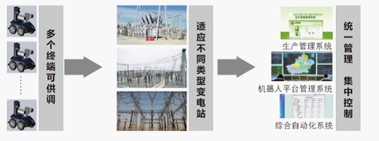 基于巡检机器人在站端独立运行的基础之上,由多台巡检机器人可构成巡检机器人平台。将巡检机器人接入综合自动化系统和生产管理系统,可实现巡检机器人业务逻辑与变电站日常生产、调度业务逻辑在数据系统上的接轨,并实现巡检机器人的集中控制、优化统一调度,以实现集群化的应用。