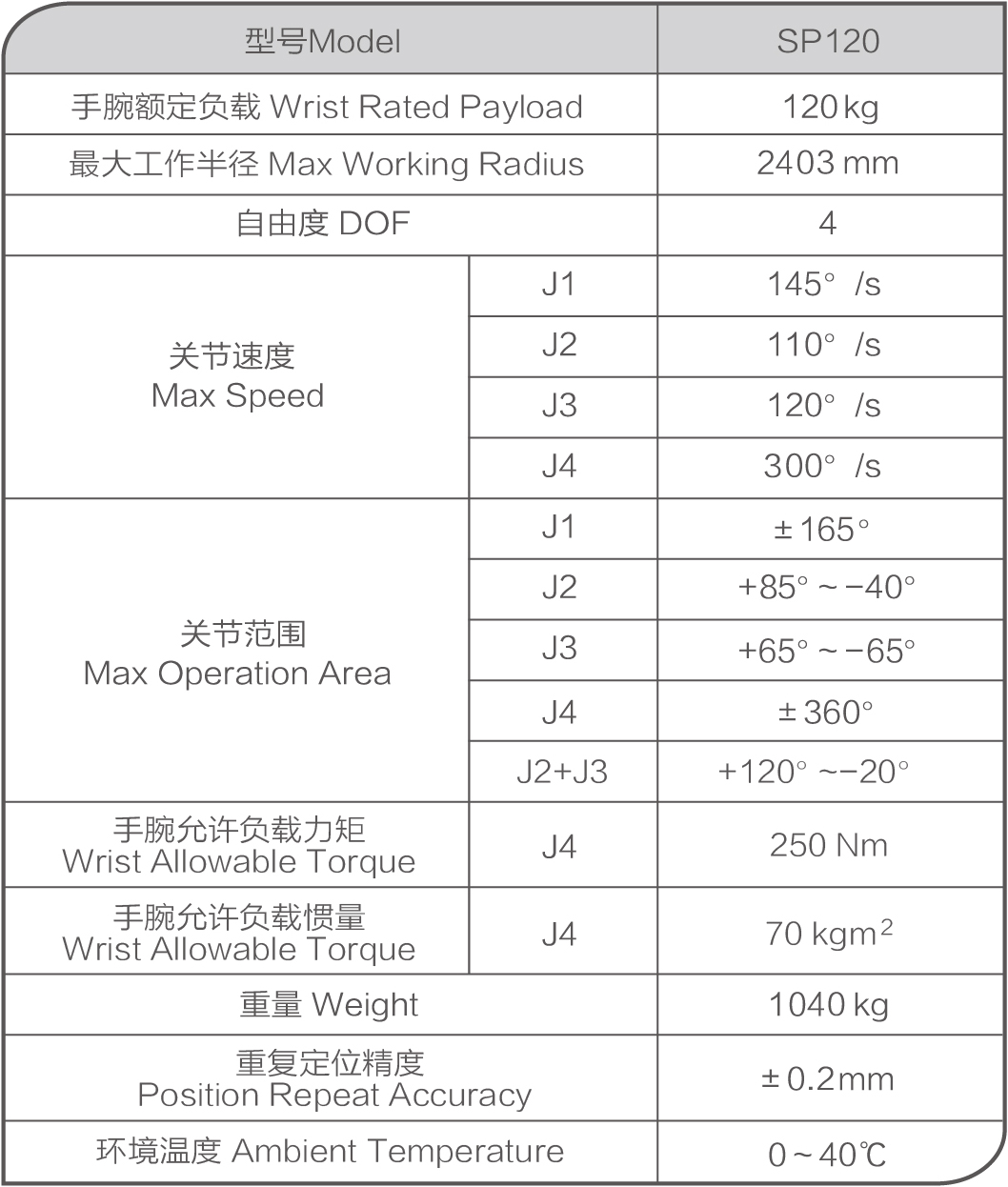 SP120特性:手腕负载能力为120Kg,最大工作半径为2403mm。