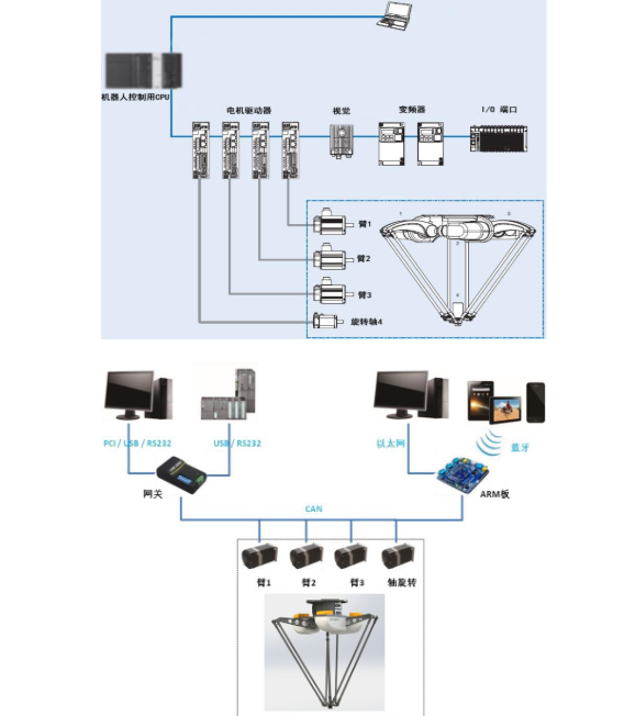 功能:分拣、抓取、搬运、封装物件。结构:一种Delta并联机器人,包括基座固定板,基座固定筒,三叶板,中轴驱动电机模组,中轴电机护罩,摇臂驱动电机模组(3个),摇臂电机护罩(3个),摇臂(3个),摇臂轴中心盖板(3个),拉杆(6根),工具端台,中轴管和滚珠花键。特色:三叶板叶片根据各伺服驱动电机模组外形定做而成,结构明快,易于安装;摇臂、三叶板、中轴管、滚珠花键的设计充分考虑了轻量和美观,整体性好,减少安装误差;电气线路集成在一块电路板上,减少接线环节,结构紧凑,控制方便;WIFI和蓝牙方式的添加,除了通过传统的工控机进行编程控制,还可通过智能移动终端如个人平板,手机等进行编程控制,实现了低成本,易维护,易使用。