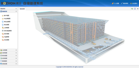 立体仓库成套设备一般由单元式钢结构货架、巷道堆垛机、入出库输送系统、计算机管理监控系统、托盘或货箱、码垛机器人等辅助设备组成。我司开发具有自主知识产权的物流系统软件(BZ-WMS),该系统包括但不仅限于以下功能:基础数据配置(如区域、货位、物料、货主、设备等)、收货管理、上架管理、下架管理、订单管理、质检管理、盘点管理、波次管理、批次管理、任务管理、图形化库存管理、策略配置、统计查询等。
