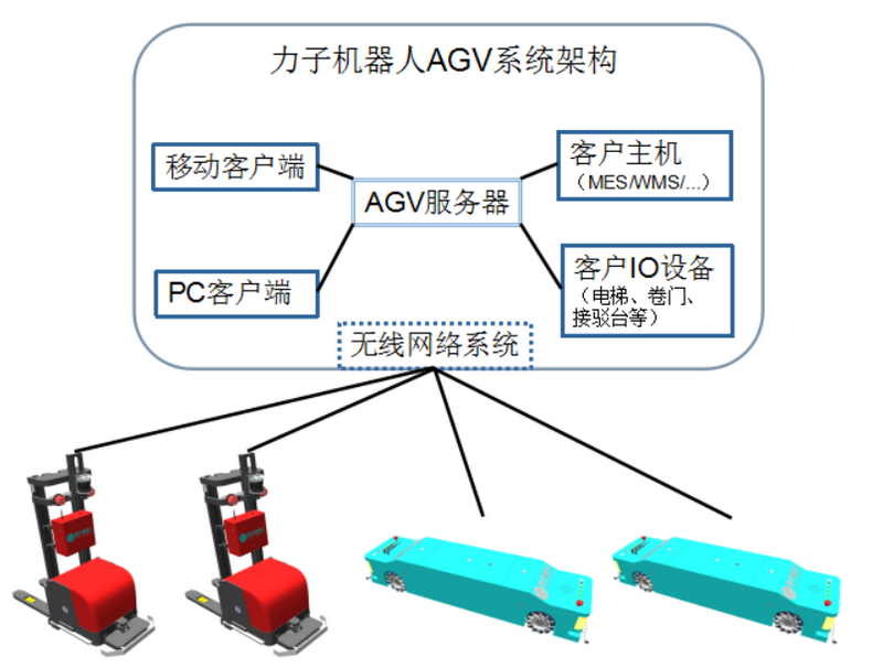 力子机器人AGV系统架构采用统一中央调度管理结合分布式车辆通信方式,以达到高效的任务调度与防止主控服务器中断对AGV系统运行的影响。