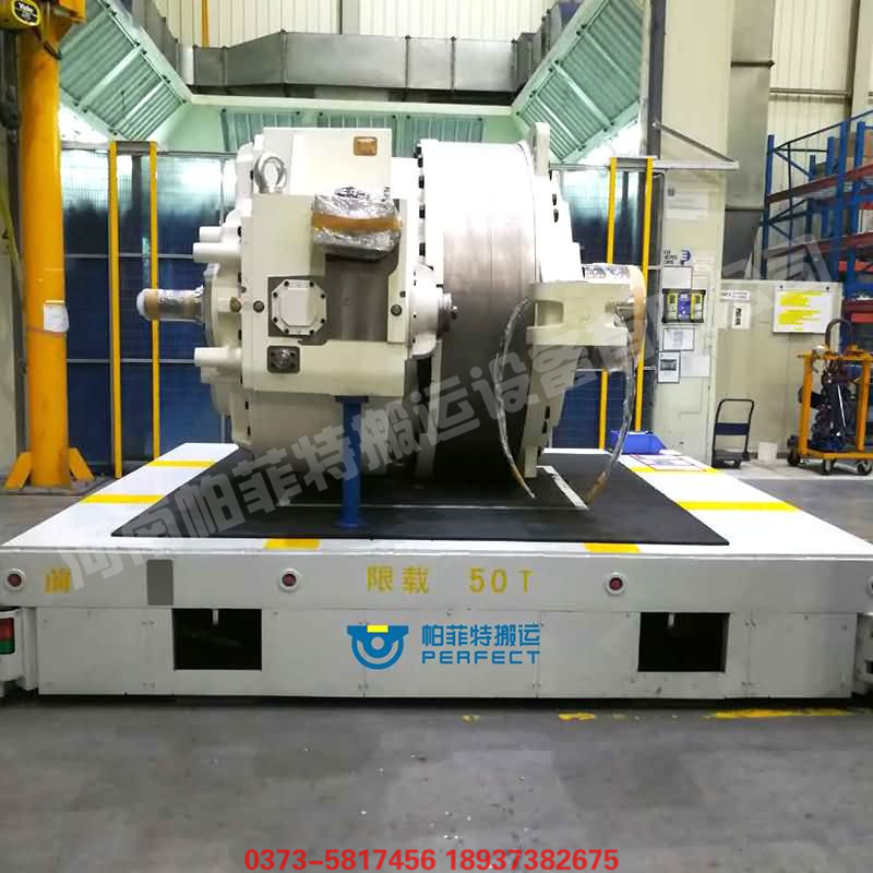 BWP系列无轨转运车由电源、传动机构、钢结构承重架、转向系统、行走机构、控制模块以及故障诊断模块组成。通常,我们选择蓄电池、电缆、发电机作为该系列车的电源,电源经过电器控制模块系统,给牵引电机提供电力,实现无轨转运车的启动、停止、前进、后退和转向以及其它功能。该系列车可实现360°原地旋转。