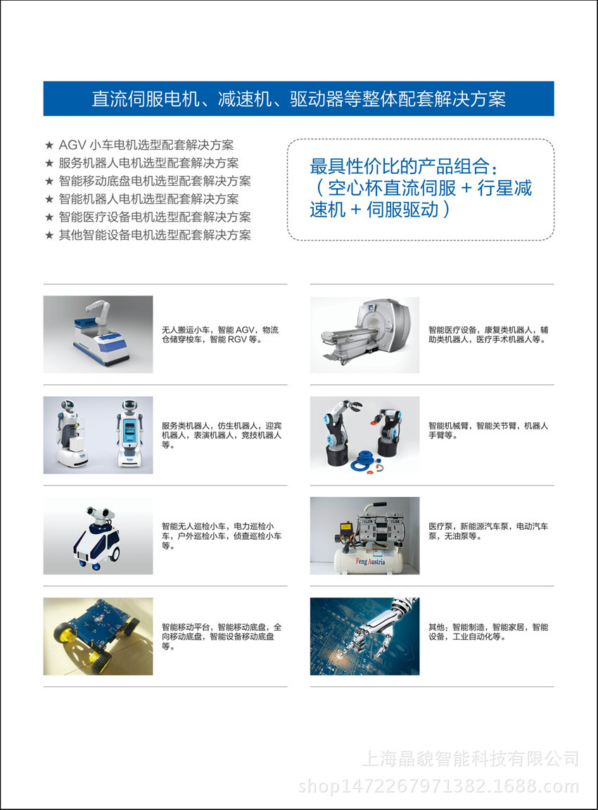 电机优势:跨时代空心杯直流电机技术,定子铜板蚀刻,无铁芯,无齿槽效应,无铁损,出色的体积功率比、重量轻,能效高、低噪音、过载能力强等特点,从而使您呈现精密的高科技空间,大量应用于AGV小车、RGV小车,智能移动平台、智能机器人、协助机器人、服务机器人、机器人关节臂、智能医疗、康复医疗等设备,同时也适用于新能源汽车无刷泵、医疗泵、执行机构等行业,如:全球500强美国托马斯及国内外众多AGV、机器人知名企业保持着长期合作关系。