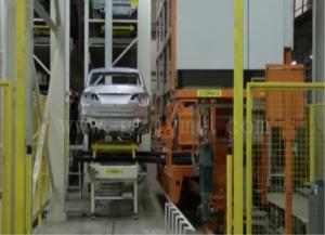用于涂装白车身的自动转运、存储,由双向辊道式AGV、立体库、堆垛机、仓储管理系统构成,下线后的白车身与AGV辊道自动对接,AGV自动运送车身入立体库对应巷道,堆垛机将车身送到对应库位。