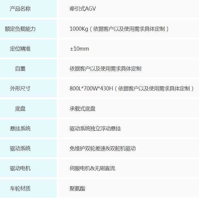 牵引式AGV,可在车体上增加可升降的动力滚筒附件进行运载并和自动流水线对接也可以在尾部拖挂动力滚筒附件和自动流水线对接,对接精度可以达到±10mm,该车型配备RFID地标模组和增强型的红外避障传感器,可以指定目的地停靠。