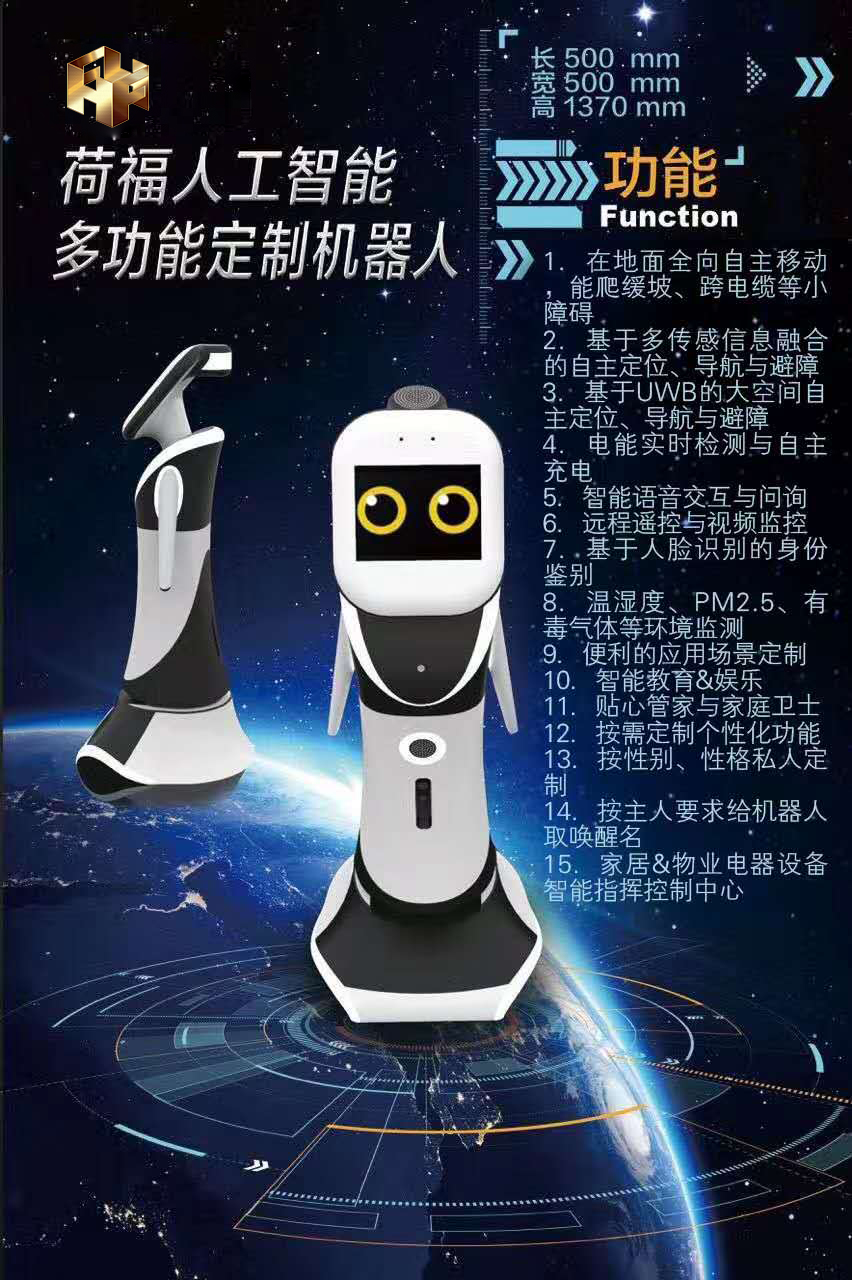 经过多年研发与验证机型试用,荷福人工智能多功能机器人即将大规模产业化,九月份接受个人及企业用户的定制化、个性化需求服务。交货周期两个月、低廉的价格、先进实用的功能、公司提供消费者五年免息消费贷款,每月花费千元左右人民币、即可收养一个机器人家庭成员回家。该型机器人集成目前全球最成熟的人工智能技术,具备目前已知人工智能机器人的所有服务功能,从家庭老人陪伴、孩子家教、智能家居系统的指挥、家庭安防、家庭成员个性化共处、企业迎宾接待、大堂经理、销售客服、领导秘书助理、私人顾问、企业移动数据平台、物联网终端服务等等,这款可以满足各种个性化需求服务的工业4.0产品等待您的垂询。