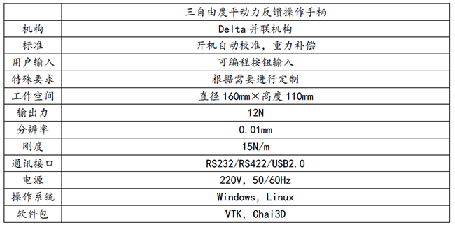 高度灵活的精密力反馈操作,独特的Delta并联机构设计,具有较高刚度和输出力,自动校准,定位精度高。高强度航空铝合金本体,关键运动部件均国外进口。控制器支持多种操作系统,软件开放,可进行二次开发,提供RS232、RS422、USB2.0多种接口。