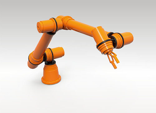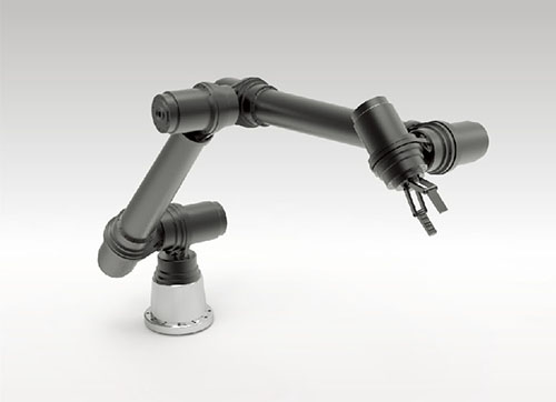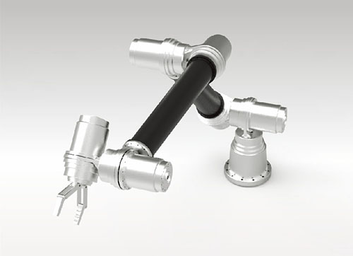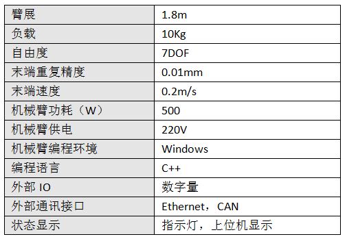 采用机/电一体化设计的力反馈模块化关节,关节内部集成了电机、抱闸、编码器、减速器、驱动器和力矩传感器,电机驱动器通过高速实时数据总线与主控制器进行通讯,机器人与主控制器之间仅需供电和数据总线连接,提高了系统的可靠性。关节为中空轴式全封闭结构,中部或尾部固定,端部输出,可根据需要更换连接杆件组合成不同的机器人结构。机械人本体具有七个自由度,末端手抓具有两个自由度,可实现对目标的抓取和旋转。