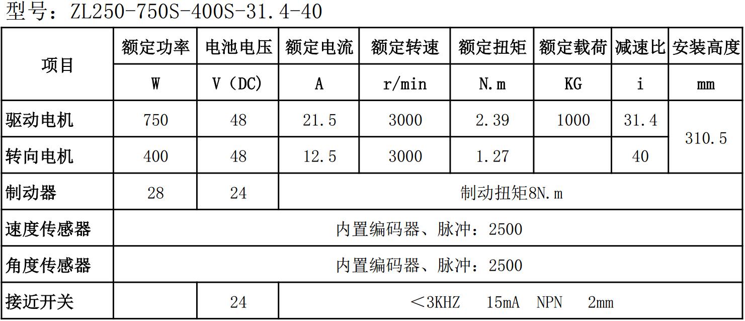 行走电机和转向电机分别为750W和400W/200W伺服电机;