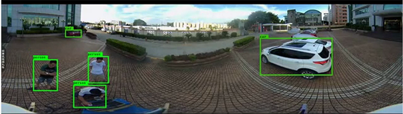 无人车搭载水平全景摄像头对场景周围人类或车辆目标识别检测。无人车搭载的摄像头可输出包含360°高清全景图像以及高清高速球局部放大画面,后台智能识别软件平台可对视频内所出现的可疑目标是否是“可疑人员”进行识别确认。
