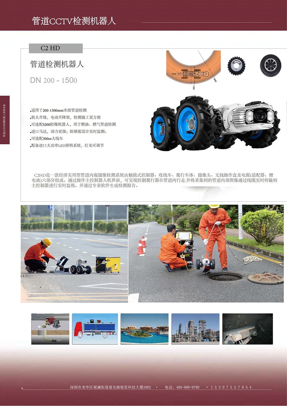 该管道机器人属于经济实用型管道内窥摄像检测系统,总研发出型号有:C1、C2、C3、C5这4款,由触摸式控制器、手动收线车、爬行车体、摄像头、无线操作盒及电源(适配器、锂电池)等部分组成。通过操作主控制器人机界面,可实现控制爬行器在管道内行走,并将采集到的管道内部圖像通过线缆实时传输到主控制器进行实时监视。
