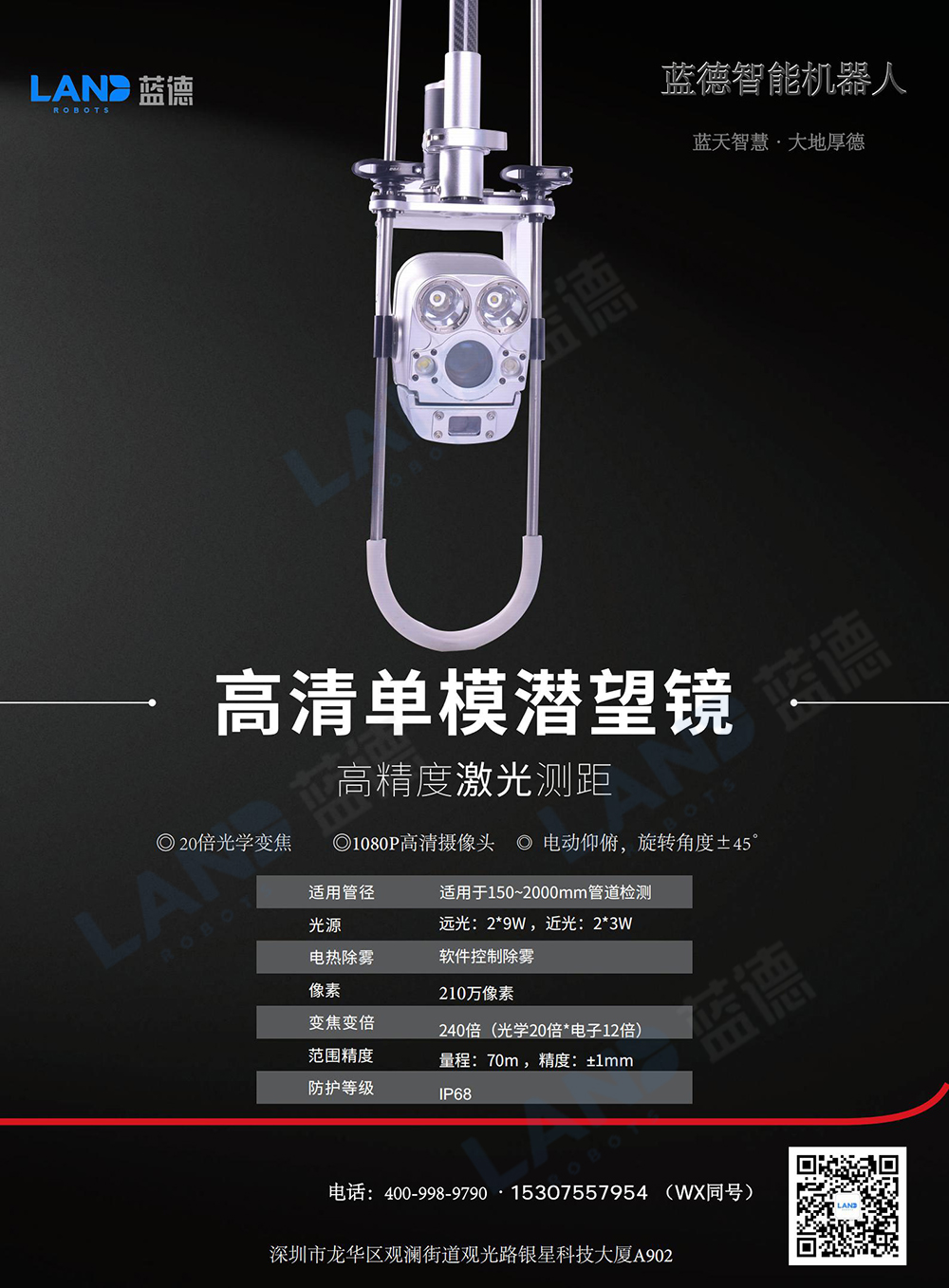 管道潜望镜—无线双模潜望镜可以用于快速检测、诊断管道内部的堵塞、坍塌、破裂等缺陷状况。在检测过程中,客户可以选择采用有线或无线的方式将视频信号、缺陷位置信号传输到手持式控制控制终端上。客户可以通过触摸屏上的虚拟按钮,控制机头的俯仰,从而获得管道缺陷位置处的清晰图像信息;同时可以对缺陷进行编码和文字描述,并叠加字符到录制的视频文件中。