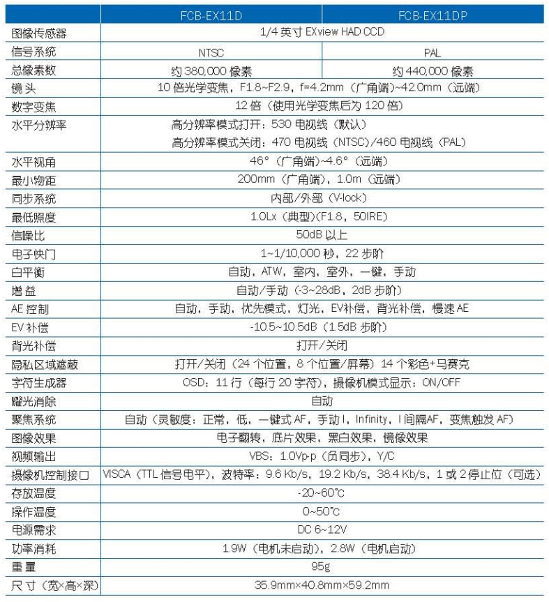 FCB-EX11DP&FCB-CX11DP 摄像机模块装有一个 10 倍光学变焦镜头,与12 倍数字变焦共同使用时,即具有了 120 倍变焦能力。
