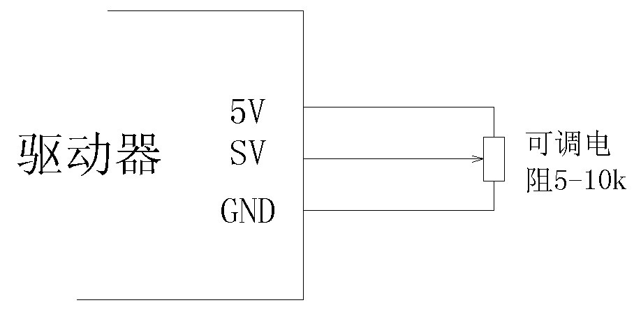 图中可调电阻的阻值应在 5K-10K 之前,在接分压电阻时应先确认好电阻的两 端及中间抽头再连接,错误的接法有可能使 5V 电源短路导致驱动器损坏。若连接后, 或在调节分压电阻时,驱动器电源 LED 指示灯变暗或者灭掉,应立即断开驱动器电源, 重新认确电阻引脚后再接。