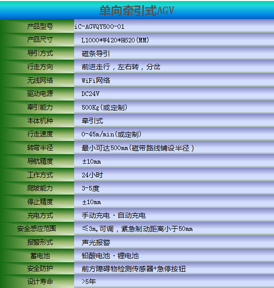 ,到达指定地点后,人工把料车挂在牵引钩上,AGV通过磁条导引读取地标指令,把料车牵引到指定位置后,自动卸下料车。一次可牵引多台料车,此车有多站点选择功能。