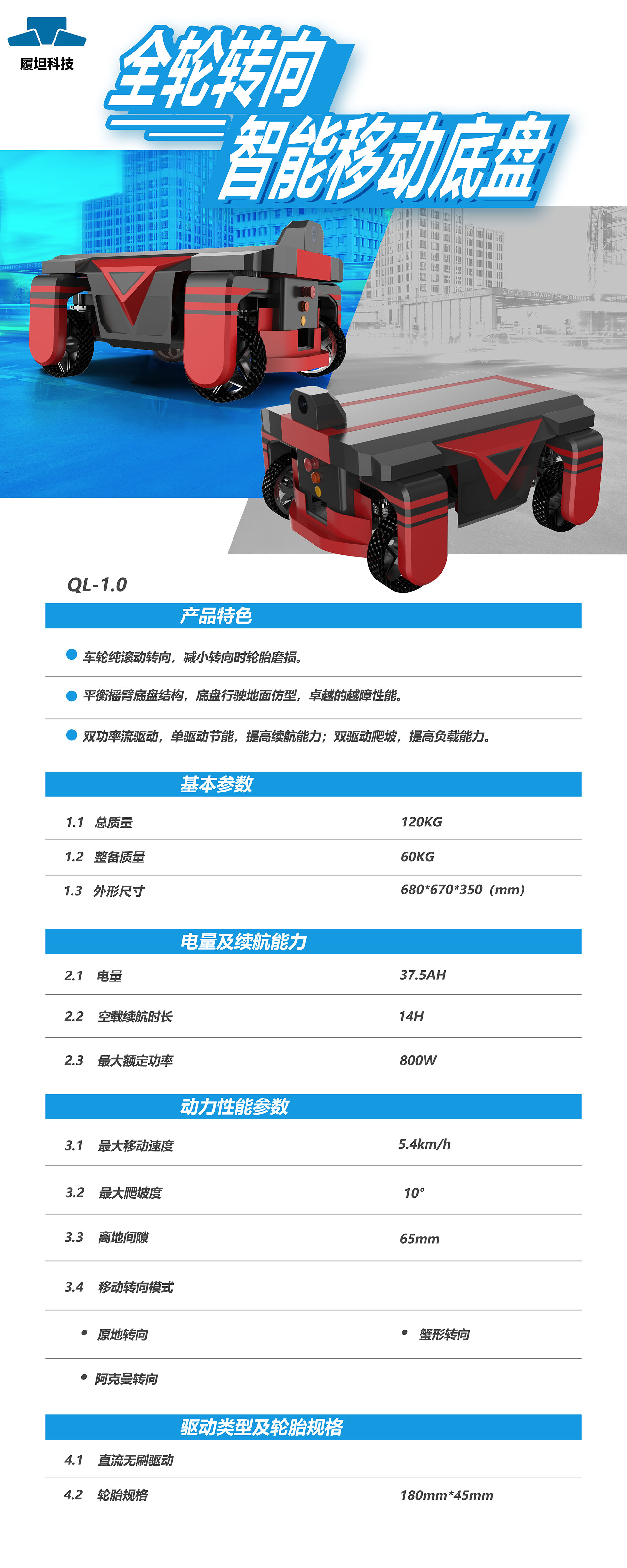 特点:车轮纯滚动转向,可减小转向时轮胎磨损;平衡摇臂底盘结构,底盘行驶地面仿形,拥有卓越的越障性能;具有双功率流驱动,可单驱动节能,提高续航能力,双驱动爬坡,提高负载力。 用途:可用于巡检、打草、短途运输等等。