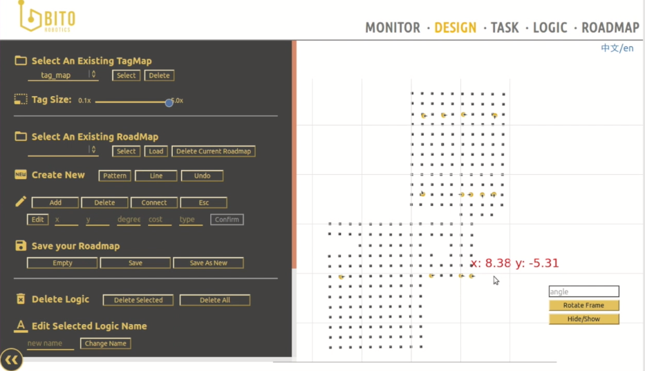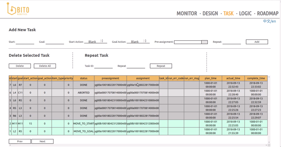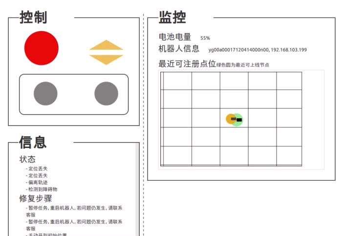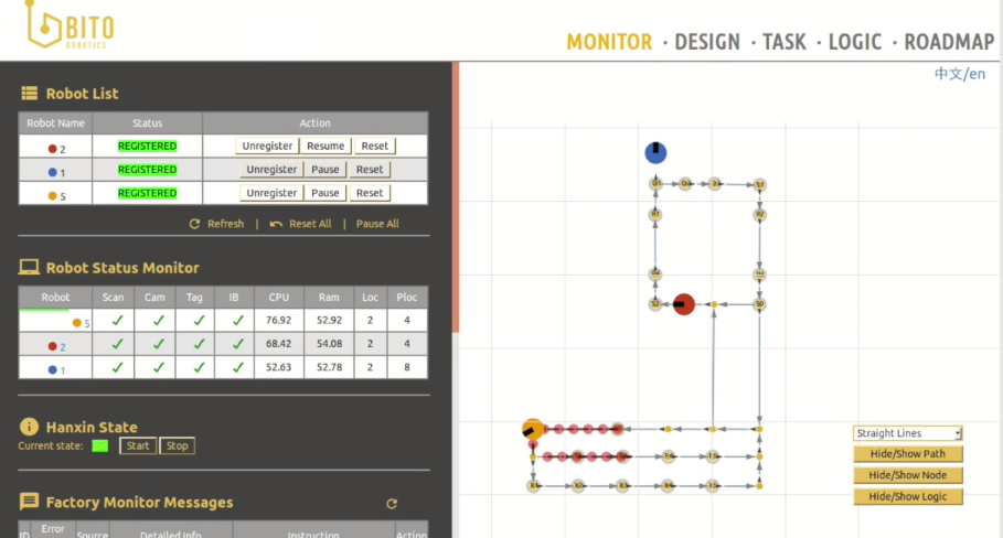 BITO的监控系统可以全面的,实时的,准确的监控系统内中控系统以及每一台机器人的运行状况,错误信息,任务执行情况等;同时,还可以为用户提供及时的信息反馈,指导用户或工作人员定位问题原因,修复故障。该系统为用户提供了良好的人机交互界面,支持多种语言自由切换,极大地方便了用户对机器人系统的使用。