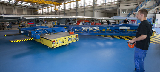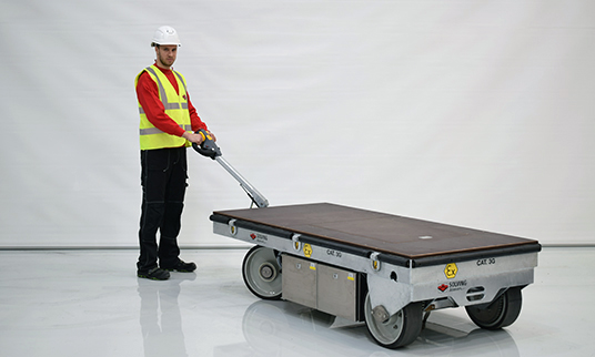 Solving的定制轮式搬运机特别适合于重载处理。自调平轴确保车轮始终始终均匀地加载并始终与地板接触。