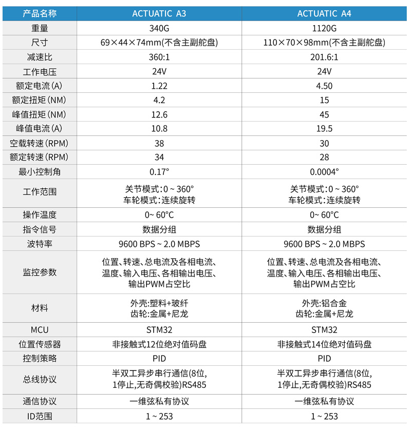 目前一维弦科技推出了两款关节伺服电机Atctuatic A3和Actuatic A4。由一维弦科技自主研发,主要应用于机器人运动关节,是电机、减速机、伺服控制一体化的智能动力装置。产品具有力矩大、精度高、抗冲击载荷性能强、功率大、使用寿命长的特点。