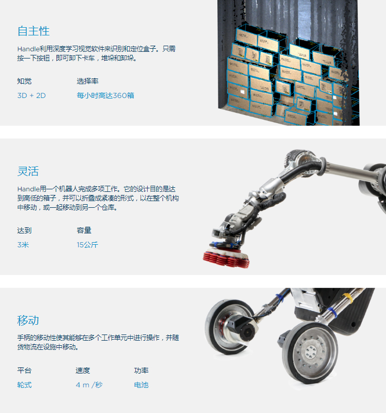用于移动仓库中箱子的移动机器人。Handle的占地面积小,触手可及和视觉系统使其能够在整个工厂中卸下卡车,堆放货盘并移动箱子。