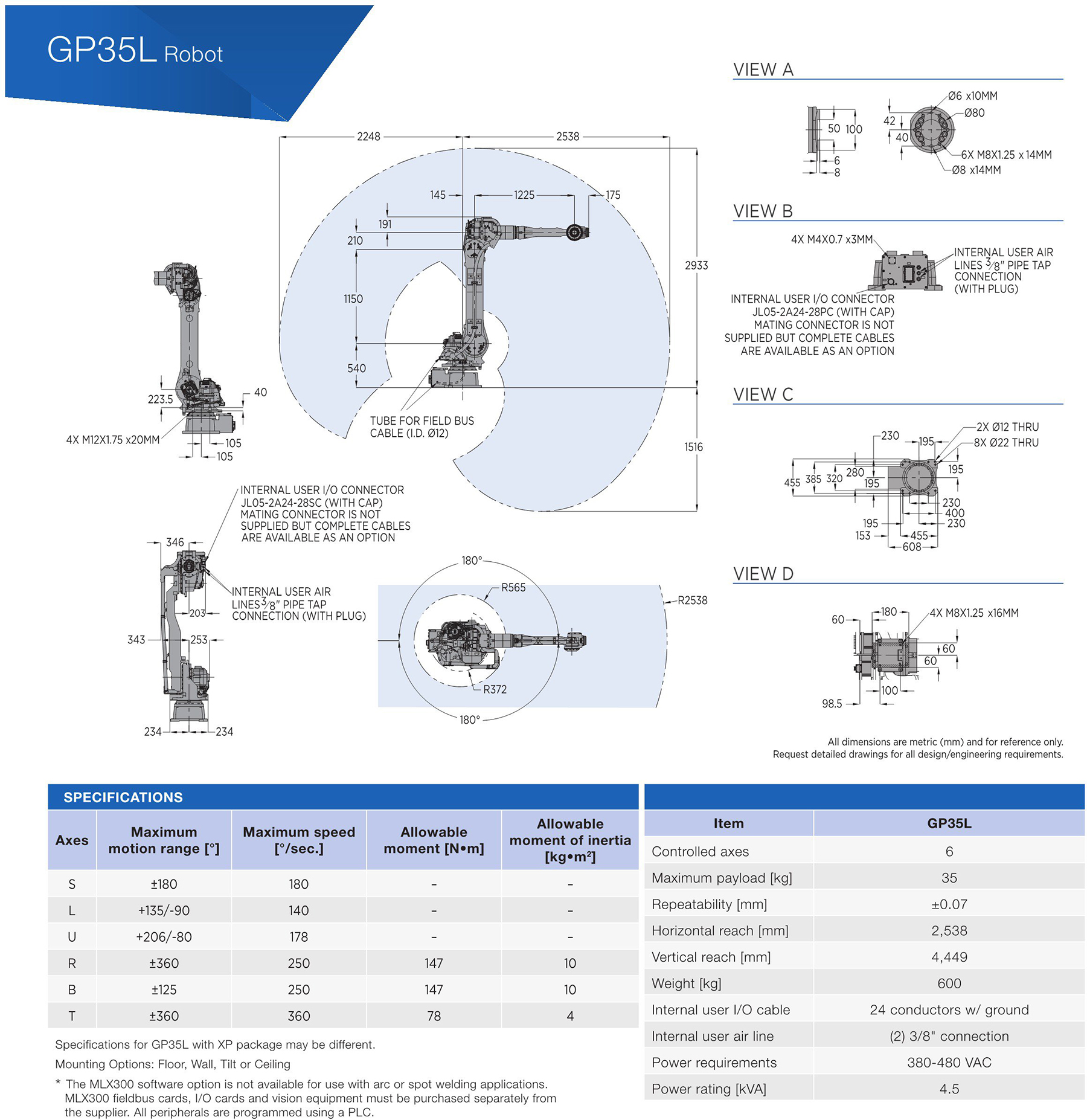强大而高效的GP35L机器人提高了各种应用的生产率。虽然快速的轴速度和加速功能减少了循环时间,但高力矩和惯性额定值却可以处理大型和重型负载。减少干扰的设计允许高密度机器人放置,流线型上臂使在狭窄区域内的零件易于进入。扩展触角可优化机器人范围,宽手腕运动消除了干扰的可能性,从而提高了应用程序的灵活性。工装和传感器的多个安装位置便于轻松集成以满足独特的项目需求。