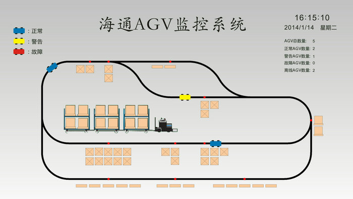 可以实时监控AGV的运行状态,如:运行信息、时间、障碍、告警等,并通过图形化的方式实时显示,并输出统计报表