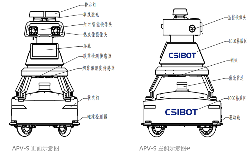 APV_S型机器人是自主研发的室外安保巡逻型机器人,整个系统由机器人本体和后台管理系统构成,通过4G/5G/wifi互联互通,共同实现室外巡逻执勤、全景监控、智能识别、监测预警、远程处置、巡逻广播等核心功能。