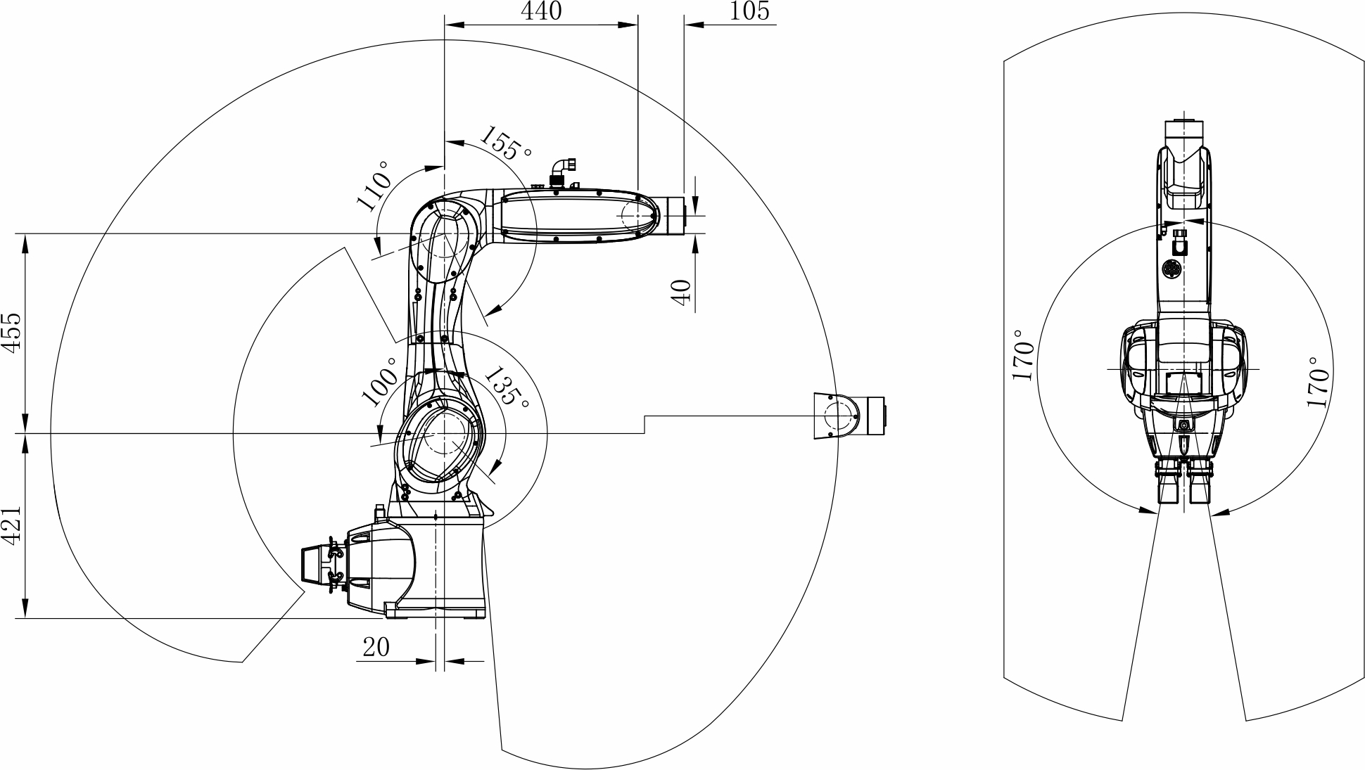 · 较同级别机器人更轻的结构设计,能够容易安装在方案内部或者倒装安装。
