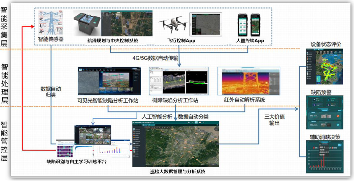 系统主要有智能采集系统、线路巡检图像缺陷智能检测系统和巡检大数据管理与分析系统组成。智能采集系统主要负责线路的数据采集;线路巡检图像缺陷智能检测系统为采集的数据进行智能故障识别;巡检大数据管理与分析系统为后台管控系统,对整个作业流程进行管控。