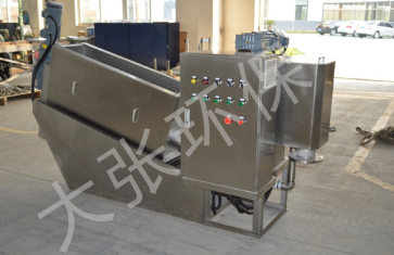 污泥通过泵,输送至污泥槽,流至混合槽内,同时絮凝剂由加药泵送至槽内,混合槽由液位控制,防止满溢。搅拌混合形成泛花,理想泛花象棉花状,一朵朵的,然后流至过滤机,液体透过动片与定片的间隙流出,固体通过螺旋旋转不断向前,在出口压板的作用下充分脱水,至出口。