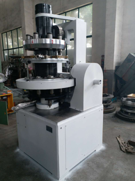 旋转压机是在上、中、下三个同轴圆盘上,设计成多个工位,每个工位都安装1套独立的模具:上冲、凹模、下冲、中心杆。每套模具分别处在压机压制曲线的填粉、预压、加压、脱模等过程中。圆盘旋转一周,即可压制出多个压件。