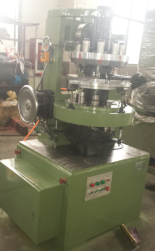 旋转压机是在上、中、下三个同轴圆盘上,设计成多个工位,每个工位都安装1套独立的模具:上冲、凹模、下冲、中心杆。每套模具分别处在压机压制曲线的填粉、预压、加压、脱模等过程中。圆盘旋转一周,即可压制出多个压件。