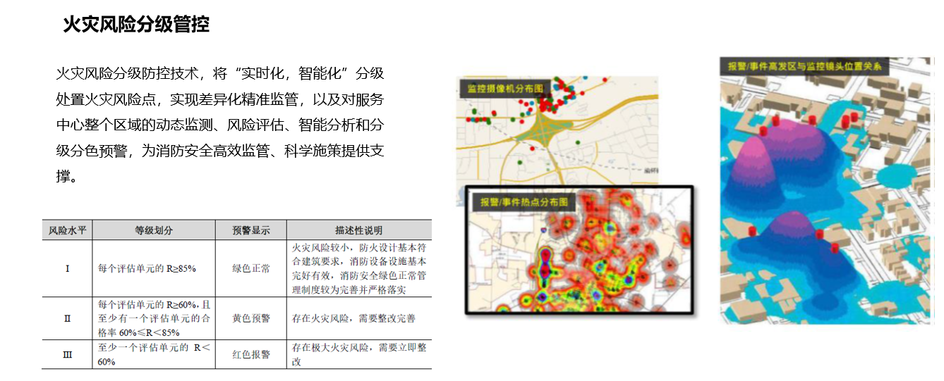 火灾风险分级防控技术,是基于“火灾风险动态评估”功能,针对建筑属性 等级设置相应阈值,当风险等级突破不同阈值时,引导消防管理者采取相应措施 降低风险等级。 当风险等级突破不同阈值时,需要“风险预警”专业技术。将建立分级风险 预警体系,例如:红色预警、橙色预警、黄色预警、蓝色预警,其中红色最高。 通过风险预警体系的建立,对建筑可能发生的火灾进行评估和预测,实现在火灾 设备报警前,尽早发现火灾发生几率高的场所。 火灾风险分级防控技术,将“实时化,智能化”分级处置火灾风险点,实现 差异化精准监管,以及对服务中心整个区域的动态监测、风险评估、智能分析和 分级分色预警,为消防安全高效监管、科学施策提供支撑。