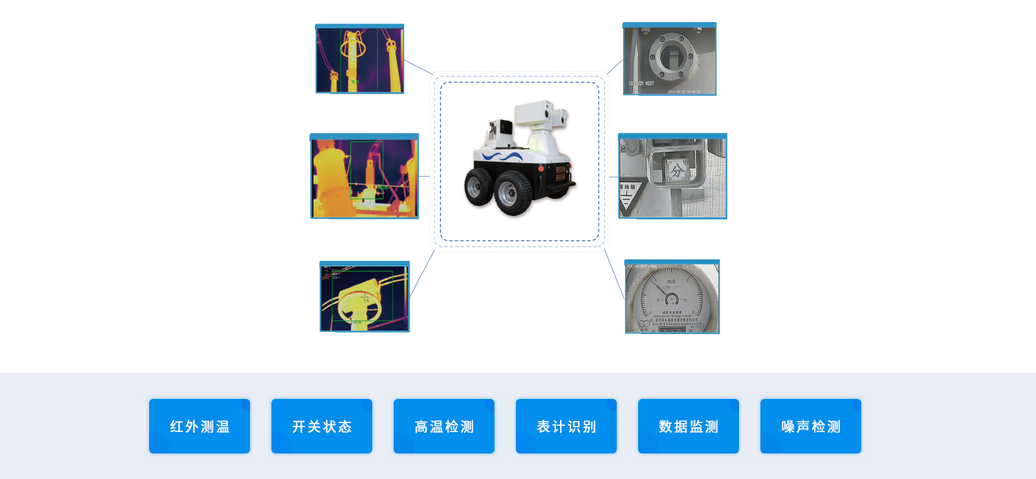 轮式巡检机器人是一个实现了自主移动,自我管理,自动避障,自动充电的智能机器人,可以实现连续不间断的巡视巡检作业,是一个通过智能机器人对厂区内设备状态进行自动化巡检的解决方案。机器人本体搭载高性能红外和可见光双路视频服务器,无线通讯系统,实现在厂站观察周围环境、监控设备运行状况以及检查设备热故障、自动识别表计读数和噪音故障检测的相关功能要求。巡检机器人能够实现厂站全天候、全自主巡检,有效降低劳动强度和变电站运维成本,提高巡检作业和管理的自动化和智能化水平。