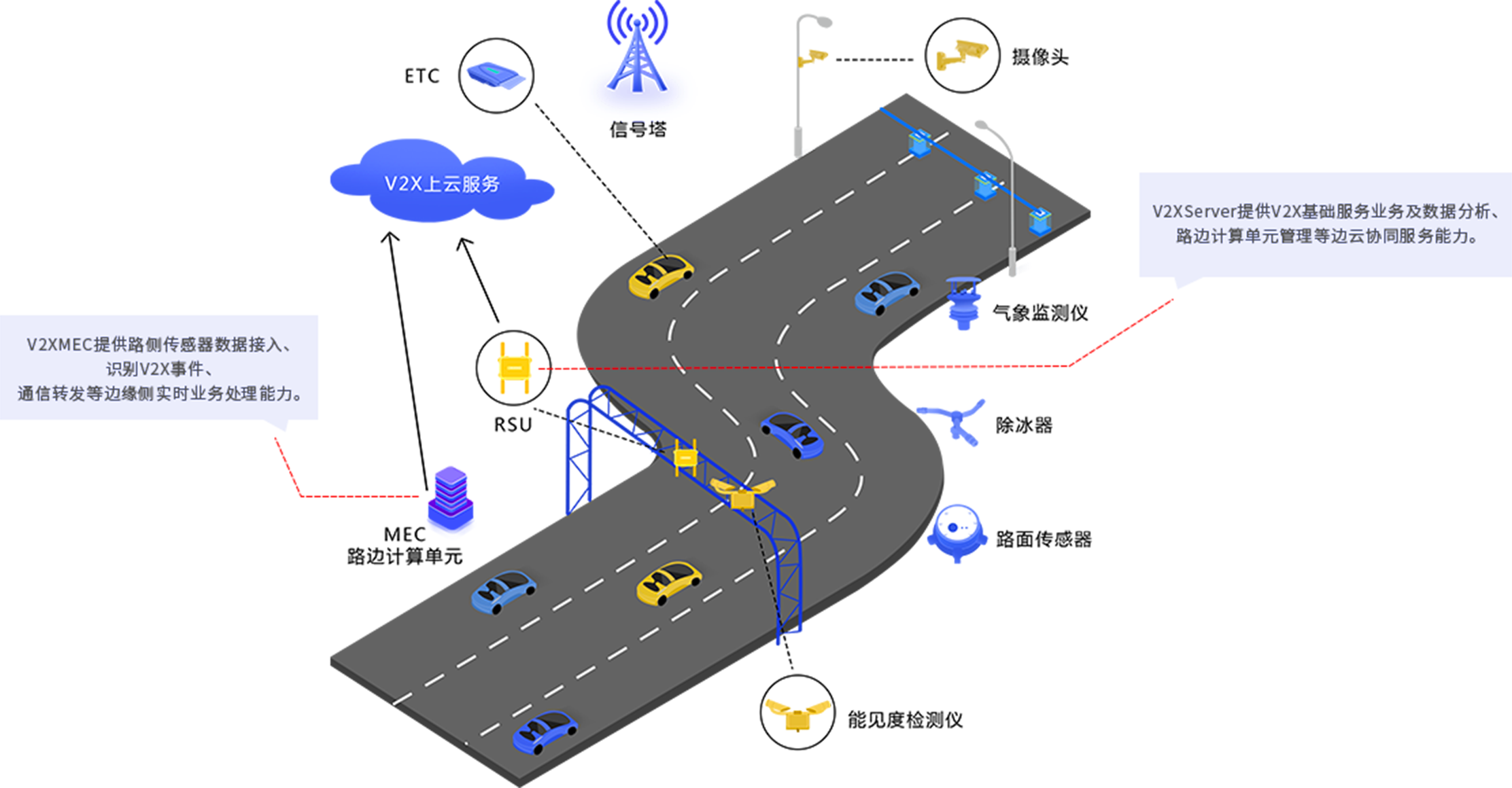 中路智链车路协同智慧路侧端解决方案包括云侧的V2XServer和边侧的V2XRSU,V2XMEC部分(如下图,车路协同路侧组网示意图):