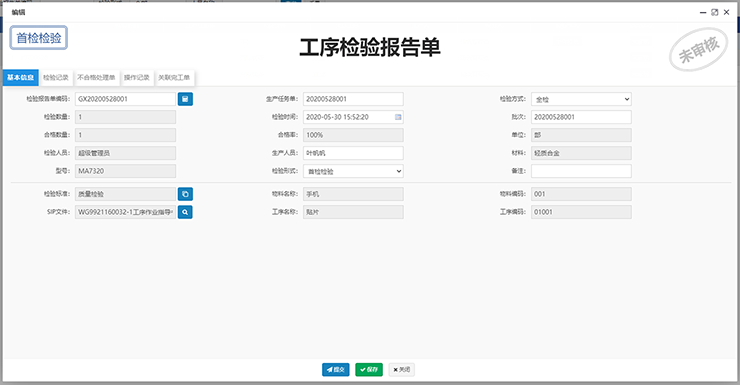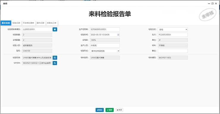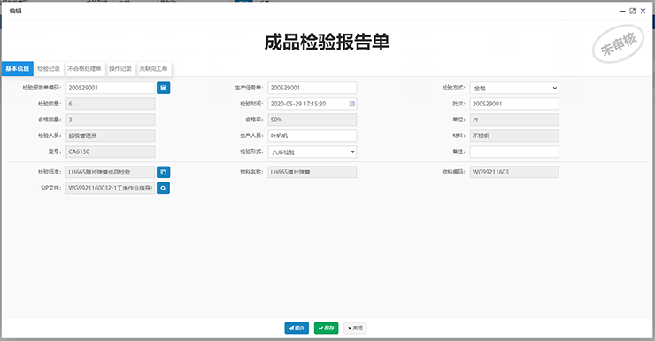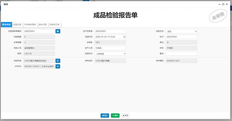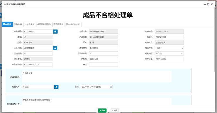 针对中小工厂在生产过程中的质量检验管理需求而研发软件。软件由JAVA语言开发,分服务器端和BS网页端。系统分检验项目、检验大类、检验标准、检验记录单、检验报告单、纠正措施单等几部分组成。管理员预先在系统内定义检验设置,检验人员后期只要引用检验标准,系统能自动判断是否合格,并且将检验数据完整的记录在系统内。当产生不合格品后,系统产生不合格品处理、纠正措施单,来防止不合格品再次发生。