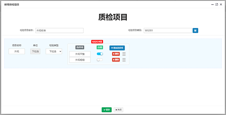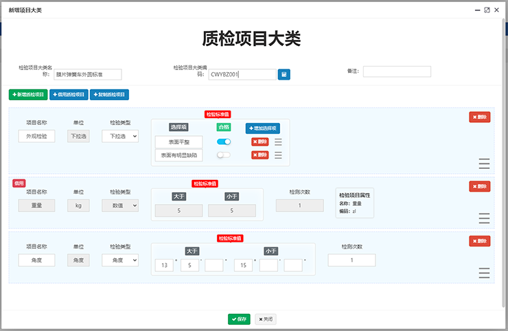 相似的检查项目可合并成一个大类。比如材料检验、外观检验、尺寸检验等。一个检查项目可以被多个大类引用。合并成大类,方便对检验项目进行分类管理,并可快速被检验对象借用。