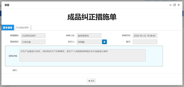 出现不合格品后,针对不合格品发生的情况出具纠正措施的整改意见,并由各部门进行签收后,讲纠错整改结果上报系统中。