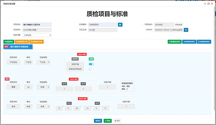 检验对象的标准,可引用检验项目或大类,并不需要针对每个检验进行定义,可大大节约设置时间。比如01阀门的硬度检验,直接引用项目库中的硬度检验,而不用单独设置。