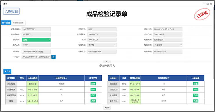 检验对象的每一个检验项目的每一次检验结果,都输入到系统中,形成检验记录单。保证所有检验数据有据可查,并且由系统来判断数值是否合格。