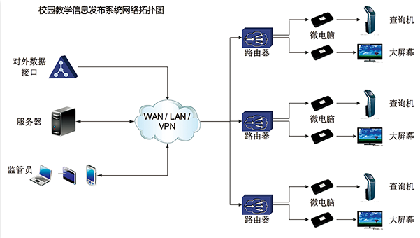 1. 根据教学需要,对安放在不同场地的显示终端进行定时、定向、定量的信息发布。
