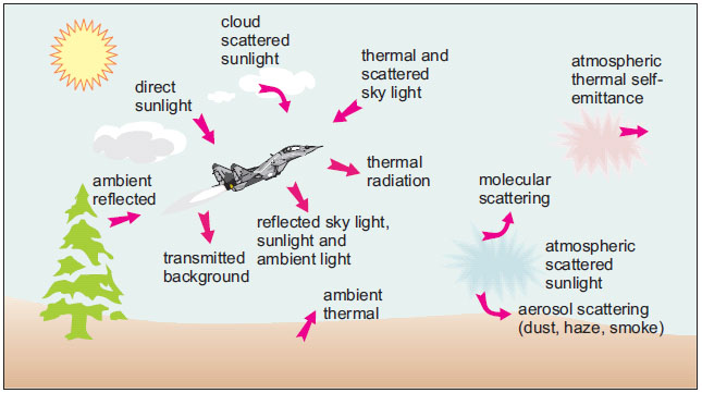 模拟目标及背景:空中目标及天空背景(包括飞机与导弹、地球大气散射和辐射形成的天空背景、云、雾、雨、雪等)、海面目标与海面(包括各种水面舰艇、海面自身的热发射和天空辐射的反射)、地面目标与地物(包括坦克、车辆、火炮、电站、桥梁、机场、建筑物)等;