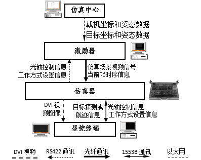仿真中心产生机载红外搜索跟踪仪工作过程中的模拟飞行数据;IRST激励器产生符合机载红外搜索跟踪仪观瞄特征的激励视频;IRST仿真器实现符合机载红外搜索跟踪仪的图像处理和信号处理流程的综合处理功能;显控终端显示仿真器输出的视频图像和目标信息态势,并实现人机交互功能。