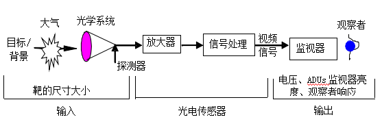 光电性能评估功能采用光电性能评估数学模型计算。技术原理如下图所示。建立目标/背景、大气、光机电、传感器、人眼、稳瞄、干扰等传递函数(MTF),根据探测识别准则,建立光电系统性能评估模型,计算光电系统对目标的探测、识别性能。建立新型光电系统和部件为研究对象,基于光学、电子学、信号及图像处理等理论与工程算法,优化传统光电系统传递函数模型及计算机仿真模型,建立光电系统性能参数的仿真计算模型。