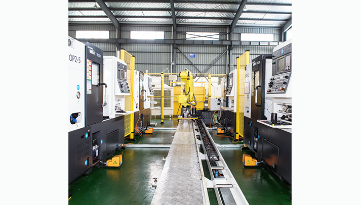 1台FANUC M-20IA 机器人搭配4台E200C 数控车床自动化上下料作业,同时配置链板式上料仓、输送带式下料仓、总控系统,保证产品准确有序的加工。