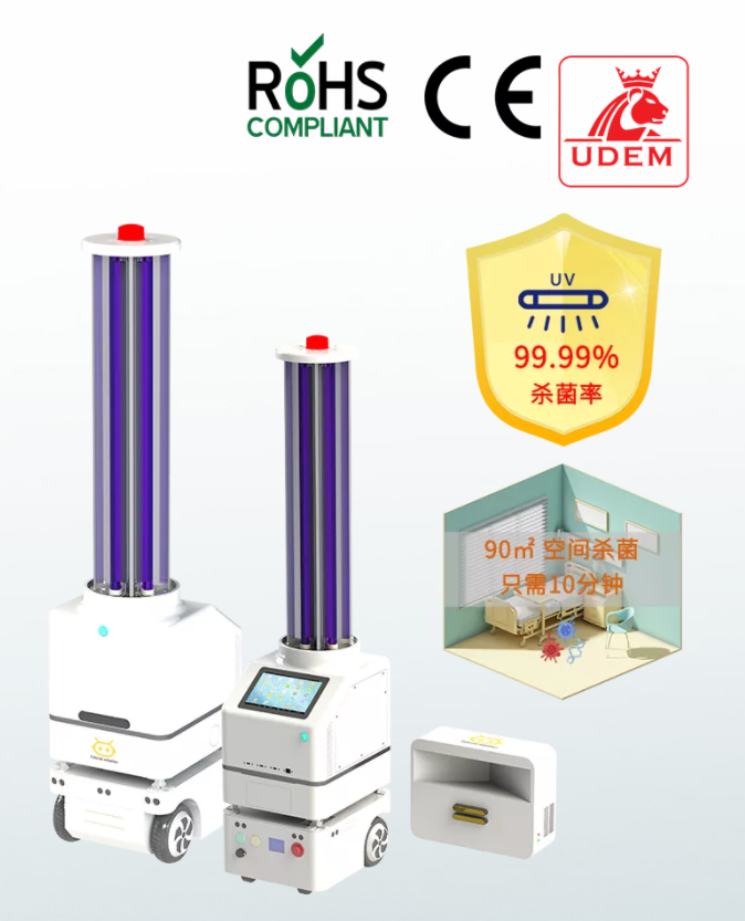 Futural U1 紫外线消毒机器人以智能移动机器人为载体,集成紫外线杀菌技术和人体感应安全系统,可应用于疫源地紧急消毒和公共场所常态化预防性消毒的一款专业紫外线消毒机器人。机器人采用国际上认可的短波紫外线(UVC)杀菌技术,通过破坏微生物细胞的DNA(脱氧核糖核酸)和RNA(核糖核酸)的分子结构,造成生长性细胞和(或)再生性细胞死亡,适当UVC照射剂量即可灭活99.99% 的病毒和细菌。根据各个应用场景不同的杀菌消毒要求,机器人可设定不同的消毒模式,包括根据场景空间大小复杂度设计的自主运行路线、消毒点位和紫外线照射剂量等。全智能化操作,7*24小时自主消杀,减轻一线防疫人员工作负担,降低人员二次感染风险,保证人员安全。
