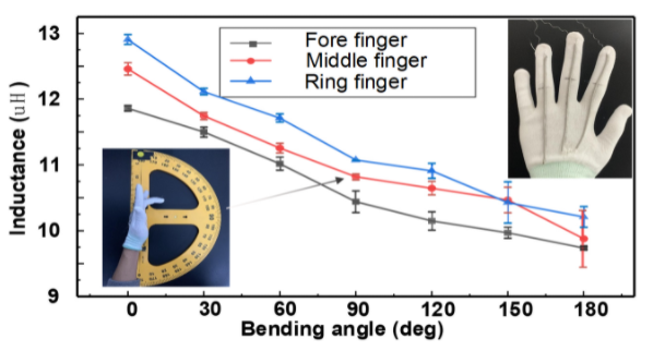公司开发出硅橡胶电容式应变传感器和细丝电感式应变传感器,两种传感器都可以检测物体的超大变形,应变检测范围0-200%。硅橡胶传感器适于贴在物体表面检测,细丝传感器适于嵌入物体内部检测。硅橡胶传感器的重复性精度2.3%;细丝传感器的重复性精度0.1%。两种传感器也可用于人体关节运动测量,如下图所示。