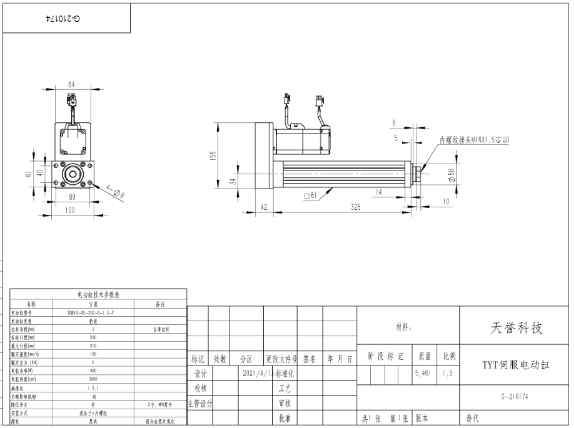 此款电动缸搭配说明:天誉DGB10-05-200-R-1.5-N电动缸+JARRETT直流伺服电机ZSMH0602-4430-T1MD-2KSW,减速比:1.5。