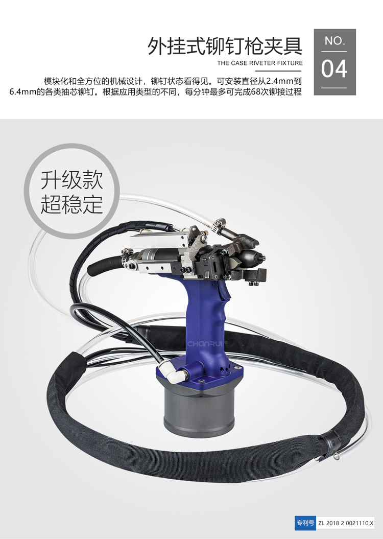 禅瑞自动抽芯铆钉机采用德国高精度加工技术。铆钉枪缸体内壁研磨精度达0.4以下,铆钉枪气缸采用锻造方式,强度增加1.6倍,6年内出货故障率控制在2%以下,配件采用德国进口碳钢3爪,使用寿命高达600万次。高效稳定,操作简单,有计数功能。