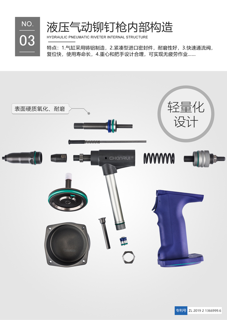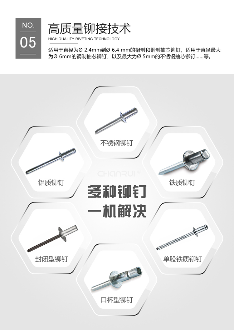 禅瑞自动抽芯铆钉机采用德国高精度加工技术。铆钉枪缸体内壁研磨精度达0.4以下,铆钉枪气缸采用锻造方式,强度增加1.6倍,6年内出货故障率控制在2%以下,配件采用德国进口碳钢3爪,使用寿命高达600万次。高效稳定,操作简单,有计数功能。